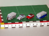 If you print it in postcard size, it will be an N gauge size. The patterns are “Citroen H Van”, “Citroen 2CV”, “Volkswagen Van” and “Fiat Panda” |